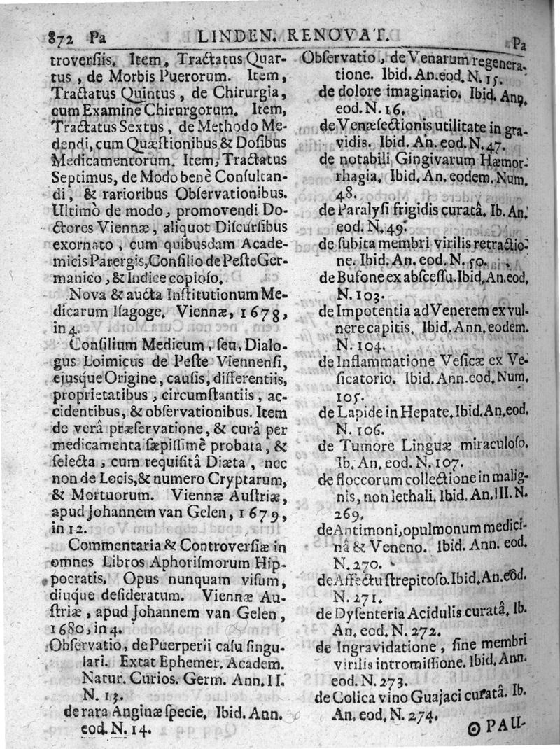 Lindenius renovatus sive Johannis Antonidae Van der Linden De Scriptis Medicis libri duo