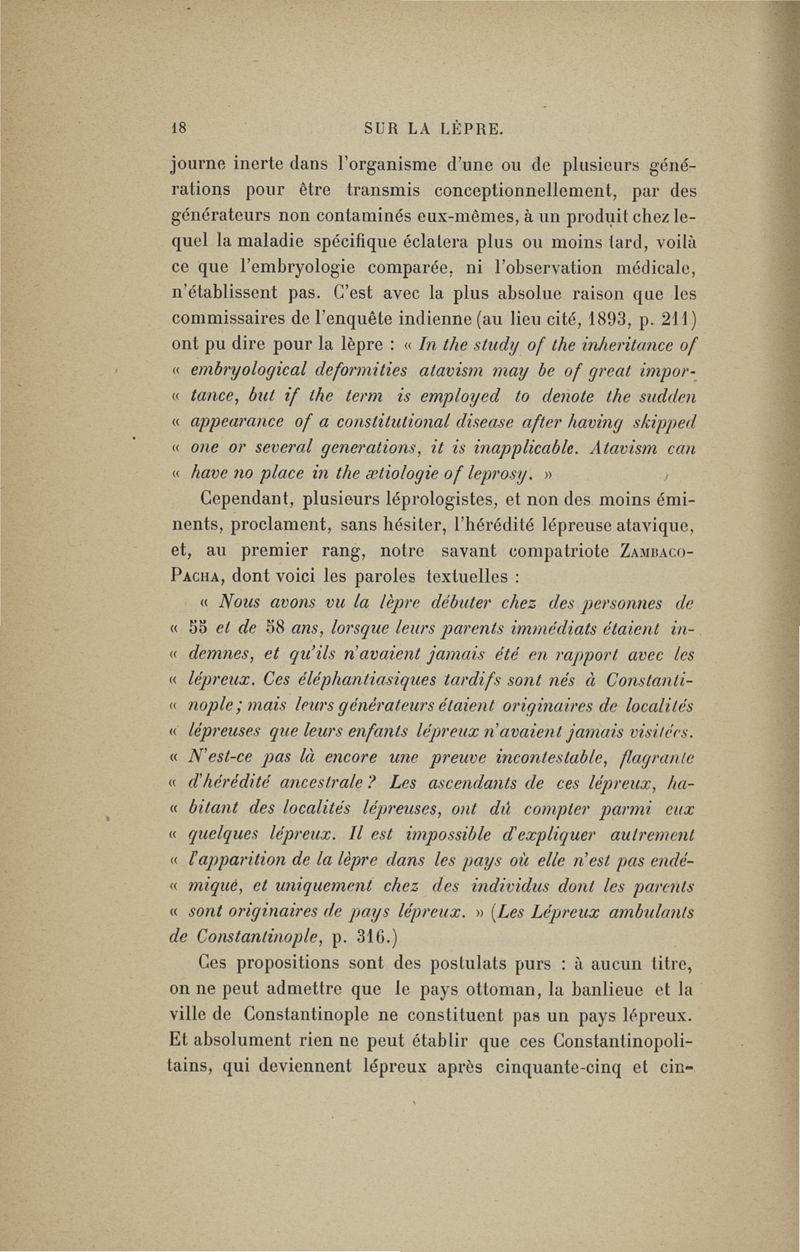 Sur la Lèpre, rôle étiologique. I. De l'hérédité. II. De la transmissibilité (nosologie générale, prophylaxie) ,... conférence de Berlin pour la lèpre, octobre 1897