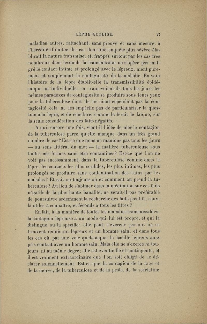 Sur la Lèpre, rôle étiologique. I. De l'hérédité. II. De la transmissibilité (nosologie générale, prophylaxie) ,... conférence de Berlin pour la lèpre, octobre 1897