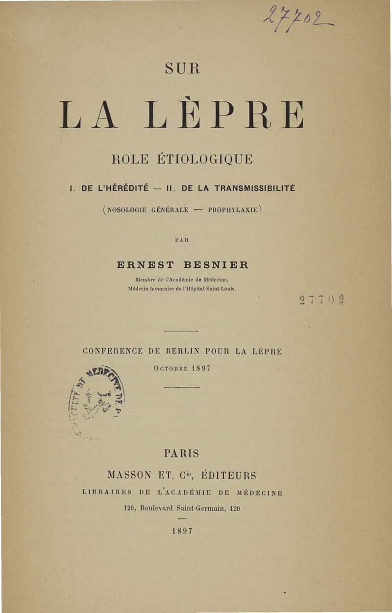 Sur la Lèpre, rôle étiologique. I. De l'hérédité. II. De la transmissibilité (nosologie générale, prophylaxie) ,... conférence de Berlin pour la lèpre, octobre 1897