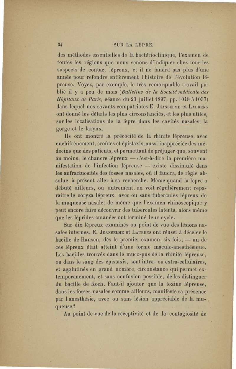 Sur la Lèpre, rôle étiologique. I. De l'hérédité. II. De la transmissibilité (nosologie générale, prophylaxie) ,... conférence de Berlin pour la lèpre, octobre 1897