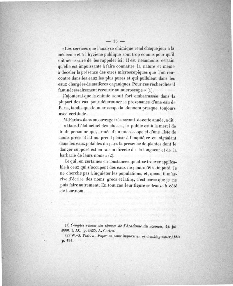 Des Eaux de Paris. Essai d'analyse micrographique comparée . Ses rapports avec l'hygiène et la pathologie