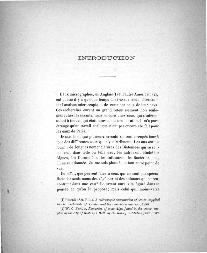 Des Eaux de Paris. Essai d'analyse micrographique comparée . Ses rapports avec l'hygiène et la pathologie