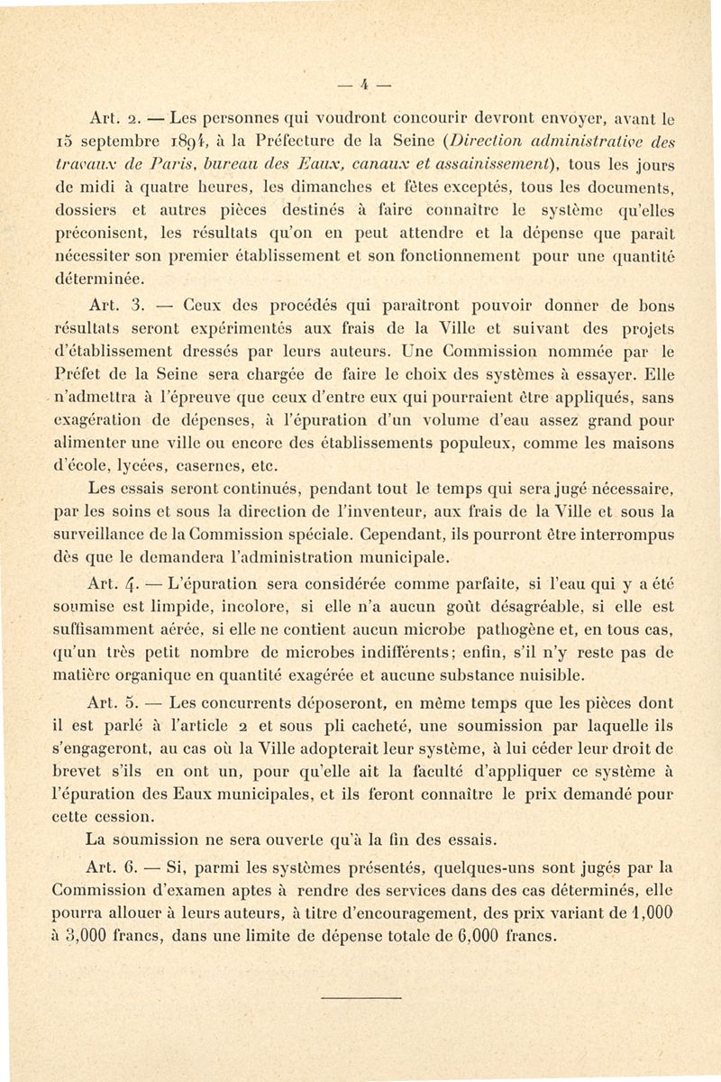 Concours pour l'épuration ou la stérilisation des eaux de rivière destinées à la boisson