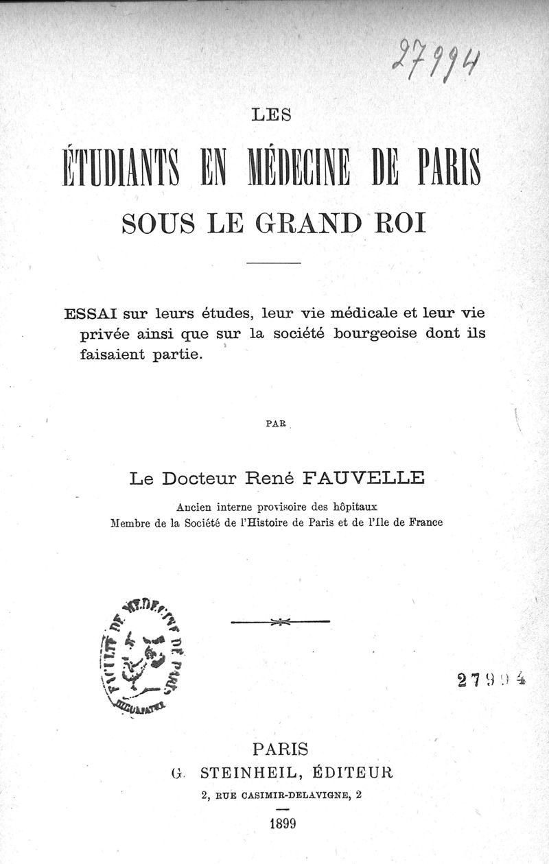 Les étudiants en médecine de Paris sous le grand roi ; essai sur leurs études, leur vie médicale et leur vie privée ainsi que sur la société bourgeoise dont ils faisaient partie
