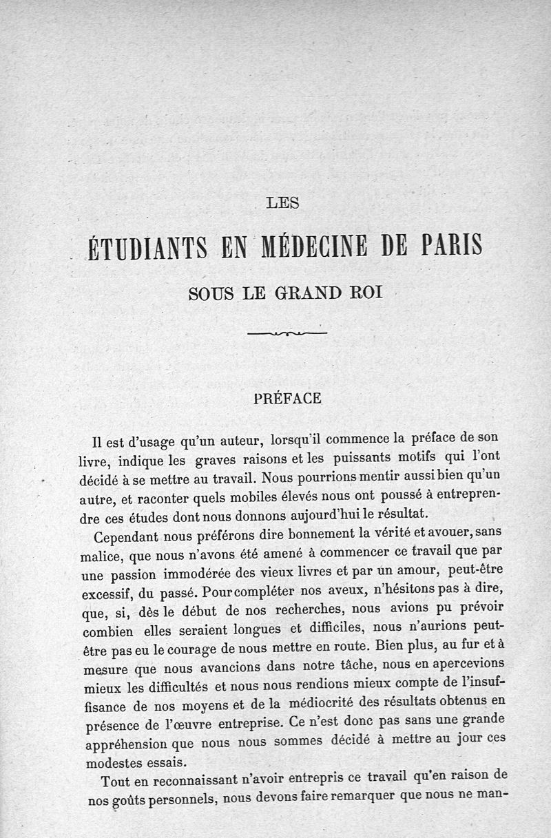 Les étudiants en médecine de Paris sous le grand roi ; essai sur leurs études, leur vie médicale et leur vie privée ainsi que sur la société bourgeoise dont ils faisaient partie
