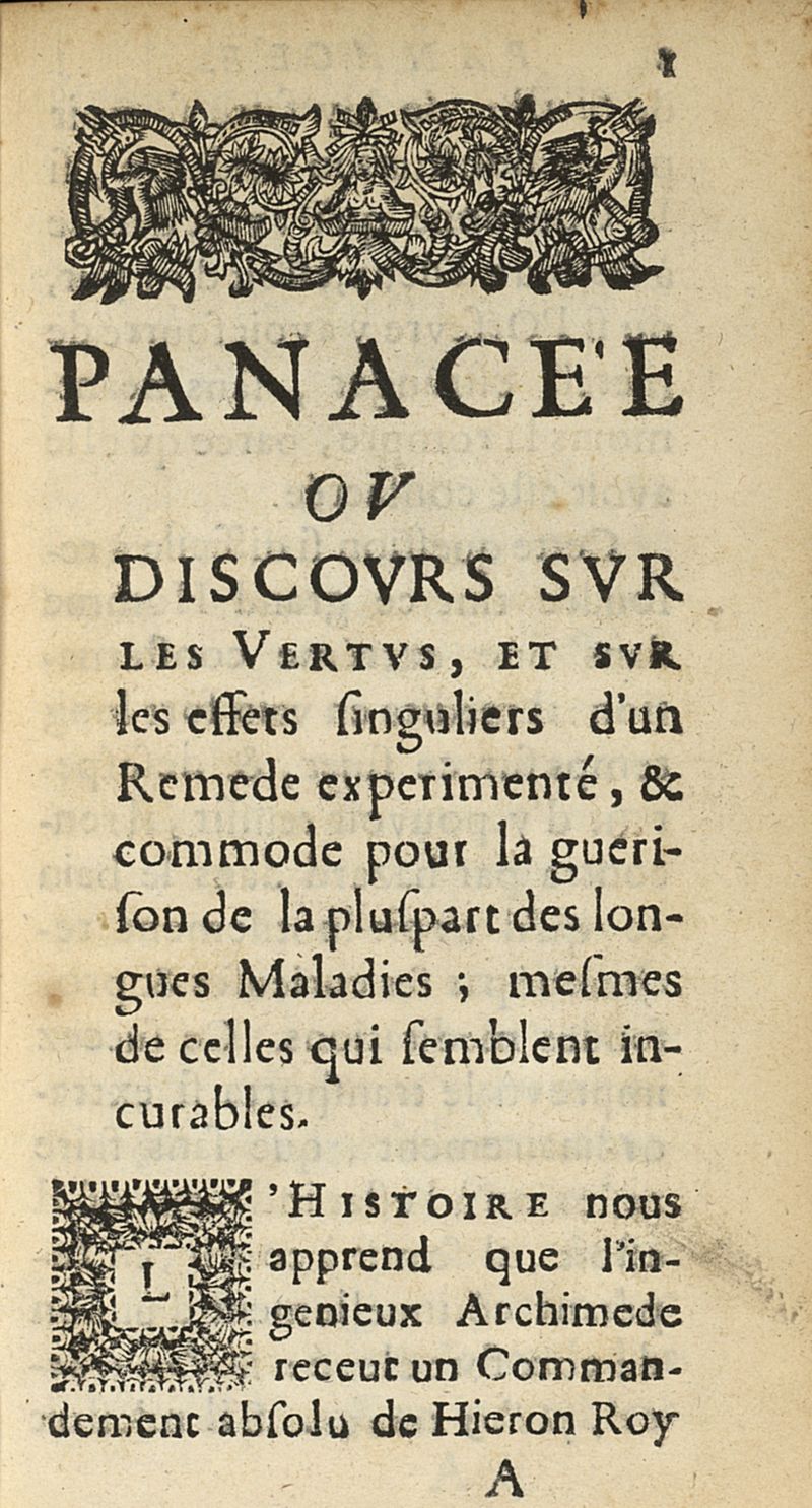 Panacée ou discours sur les effets singuliers d'un remede experimenté & commode pour la guerison de la pluspart des longues maladies ; même de celles qui semblent incurables...