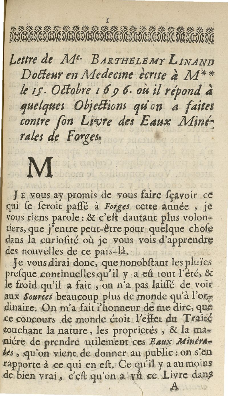 Nouveau traité des eaux minerales de Forges, où l'on fait voir dans les nouveaux principes de physique & de medecine, quelle est la nature de ces eaux...suivie d'une lettre de Me Barthelemy Linand...à M** le 15 octobre 1696...