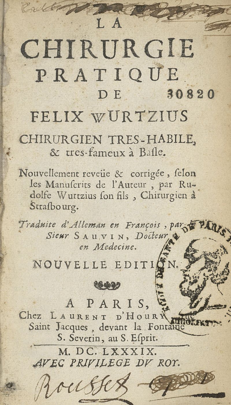 La chirurgie pratique de Felix Wurtzius chirurgien très-habile, & très fameux à Basle. Nouvellement reveuë & corrigée, selon les manuscrits de l'auteur par Rudolfe Wurtzius,...traduite de l'alleman en françois par le sieur sauvin,..nouvelle edition