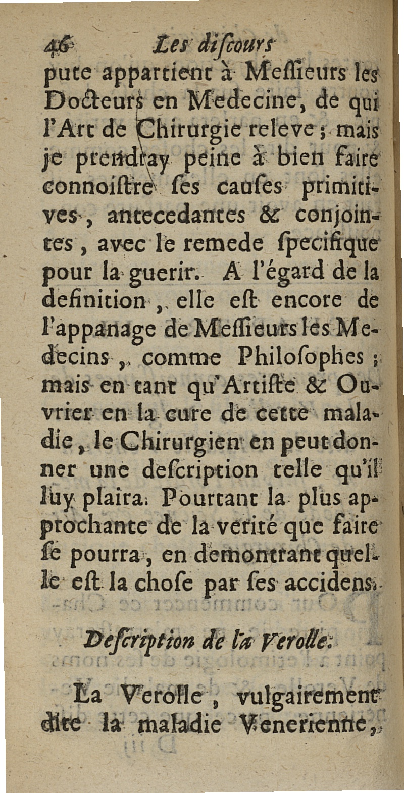 Les Discours de chirurgie. Pour l'explication des nouvelles machines pour les os, & pour la verole, ou maladie venerienne, lors qu'elle y fait des nodus & des exostoses, & des anchyloses aux jointures ; avec l'art de la guerir methodiquement par la seule application du mercure...