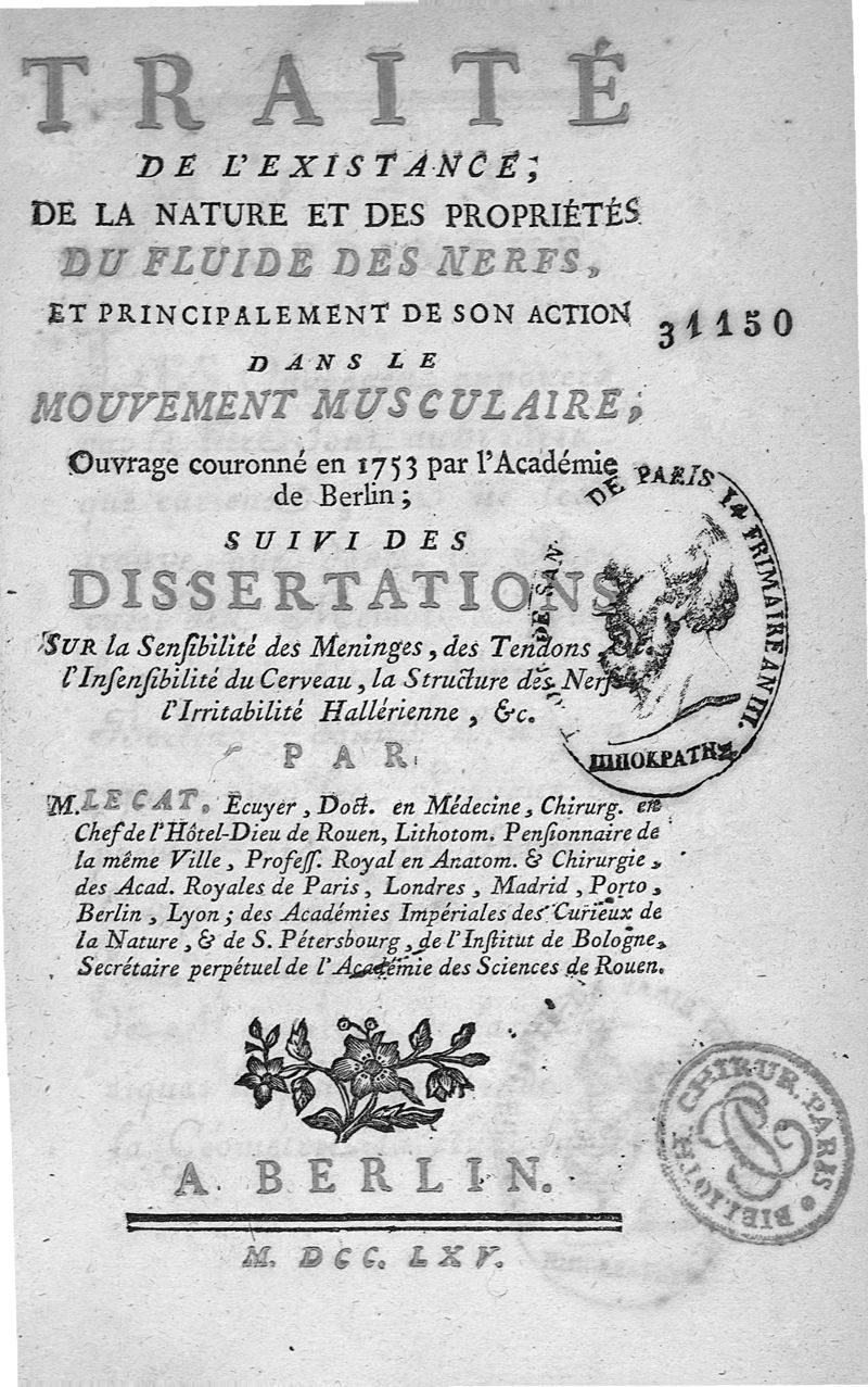 Traité de l'existance de la nature et des propriétés du fluide des nerfs, et principalement de son action dans le mouvement musculaire ... suivi des dissertations sur la sensibilité des méninges, des tendons, ...