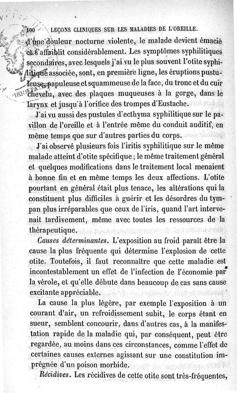 Leçons cliniques sur les maladies de l'oreille ou thérapeutique des maladies aiguës et chroniques de l'appareil auditif / [Première partie]