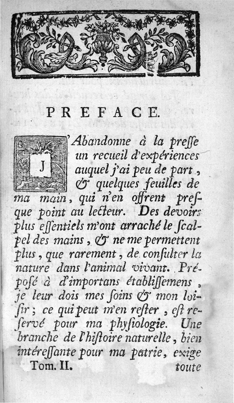 Mémoires sur les parties sensibles et irritables du corps animal; tome deuxième. Contenant les experiences de plusieurs anatomistes d'Allemagne, de France, d'Angleterre & d'Italie. Ouvrage qui sert de suite aux mémoires de Monsieur de Haller