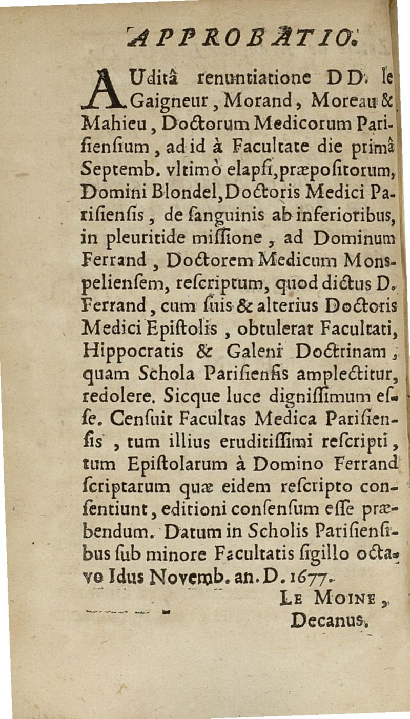 lettres apologetiques du Sr Ferrand,...adressées à Me I....dans lesquelles il est traité & prouvé qu'il ne faut point saigner les pleuretiques au pied...