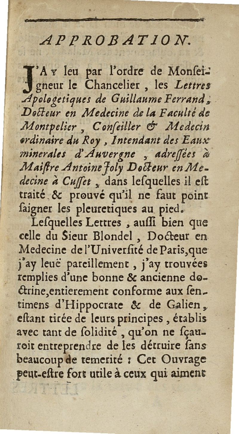 lettres apologetiques du Sr Ferrand,...adressées à Me I....dans lesquelles il est traité & prouvé qu'il ne faut point saigner les pleuretiques au pied...