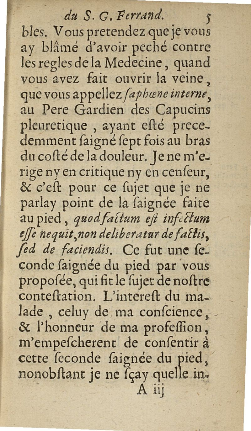 lettres apologetiques du Sr Ferrand,...adressées à Me I....dans lesquelles il est traité & prouvé qu'il ne faut point saigner les pleuretiques au pied...