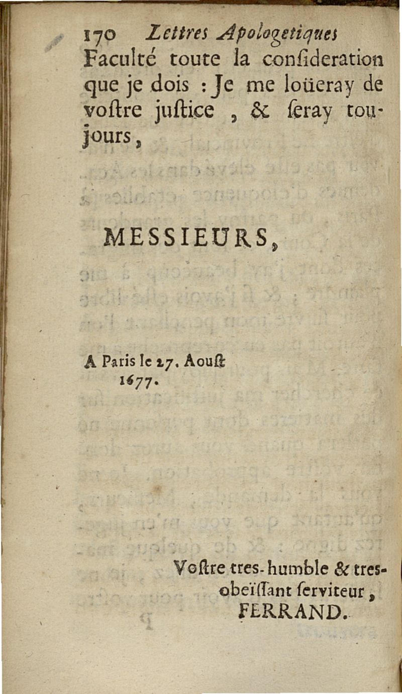lettres apologetiques du Sr Ferrand,...adressées à Me I....dans lesquelles il est traité & prouvé qu'il ne faut point saigner les pleuretiques au pied...