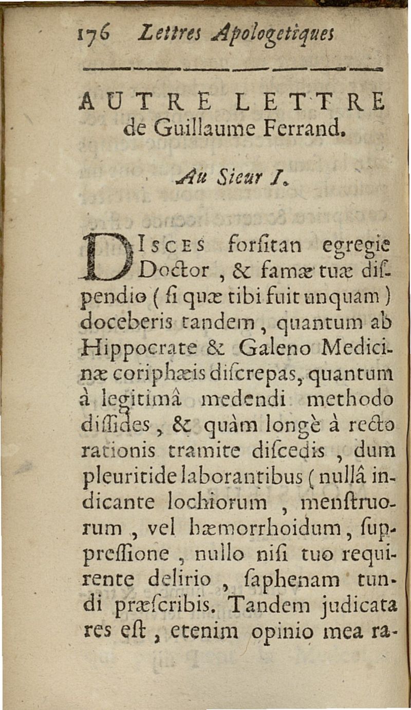 lettres apologetiques du Sr Ferrand,...adressées à Me I....dans lesquelles il est traité & prouvé qu'il ne faut point saigner les pleuretiques au pied...