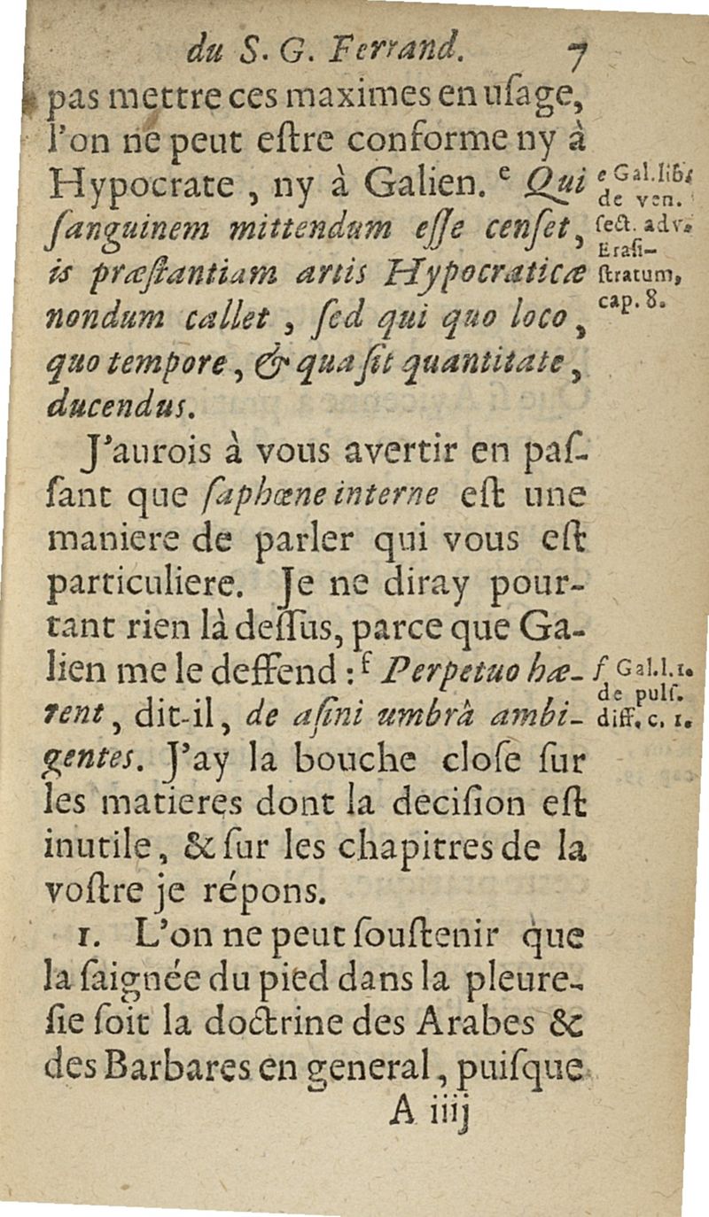 lettres apologetiques du Sr Ferrand,...adressées à Me I....dans lesquelles il est traité & prouvé qu'il ne faut point saigner les pleuretiques au pied...