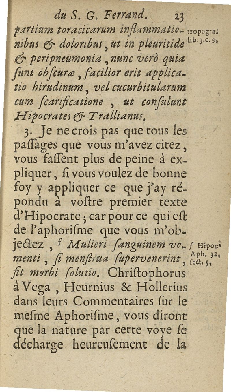 lettres apologetiques du Sr Ferrand,...adressées à Me I....dans lesquelles il est traité & prouvé qu'il ne faut point saigner les pleuretiques au pied...