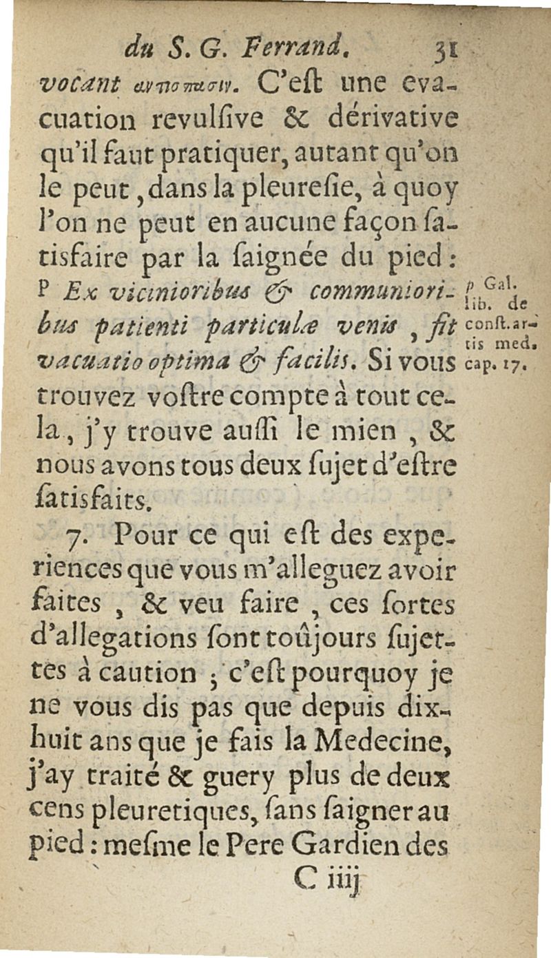 lettres apologetiques du Sr Ferrand,...adressées à Me I....dans lesquelles il est traité & prouvé qu'il ne faut point saigner les pleuretiques au pied...