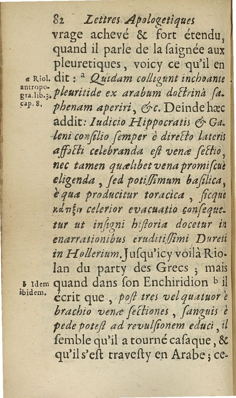 lettres apologetiques du Sr Ferrand,...adressées à Me I....dans lesquelles il est traité & prouvé qu'il ne faut point saigner les pleuretiques au pied...