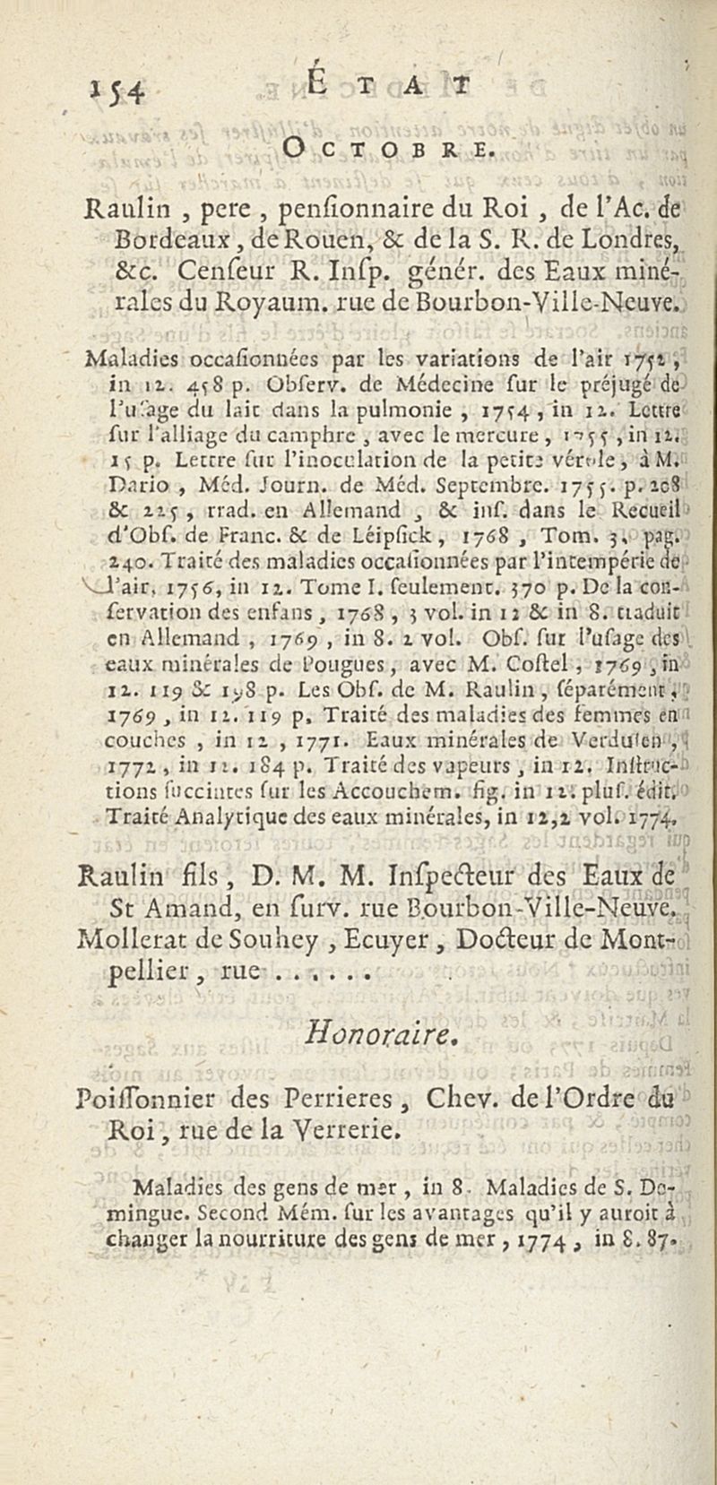 État de médecine, chirurgie et pharmacie, en Europe pour l'année 1776 présenté au Roi