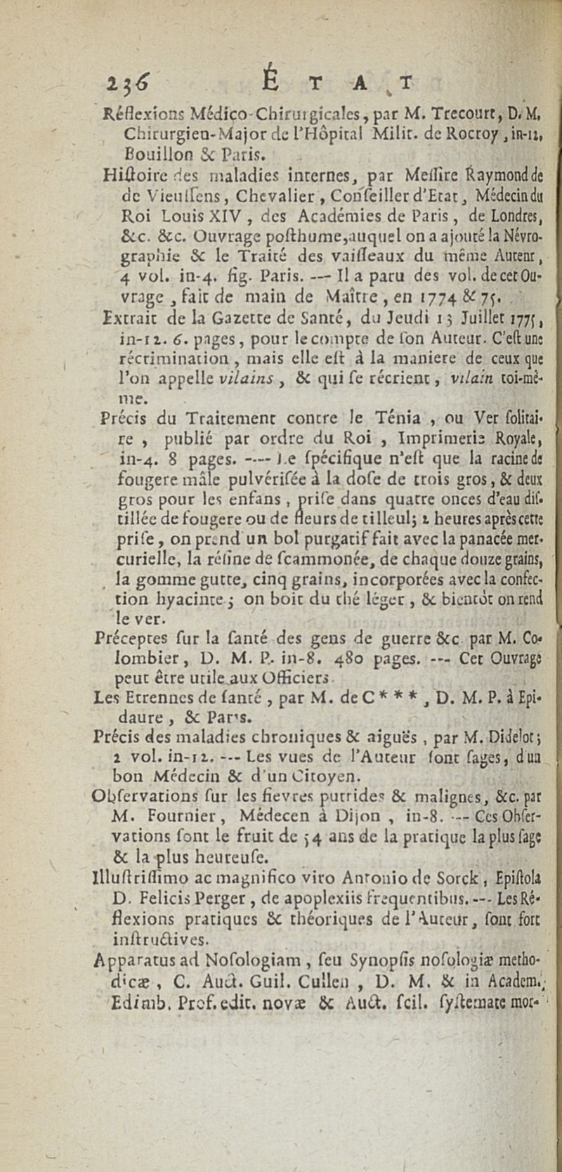 État de médecine, chirurgie et pharmacie, en Europe pour l'année 1776 présenté au Roi