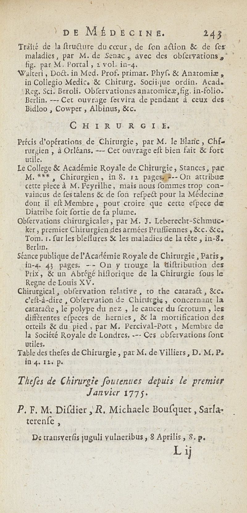 État de médecine, chirurgie et pharmacie, en Europe pour l'année 1776 présenté au Roi