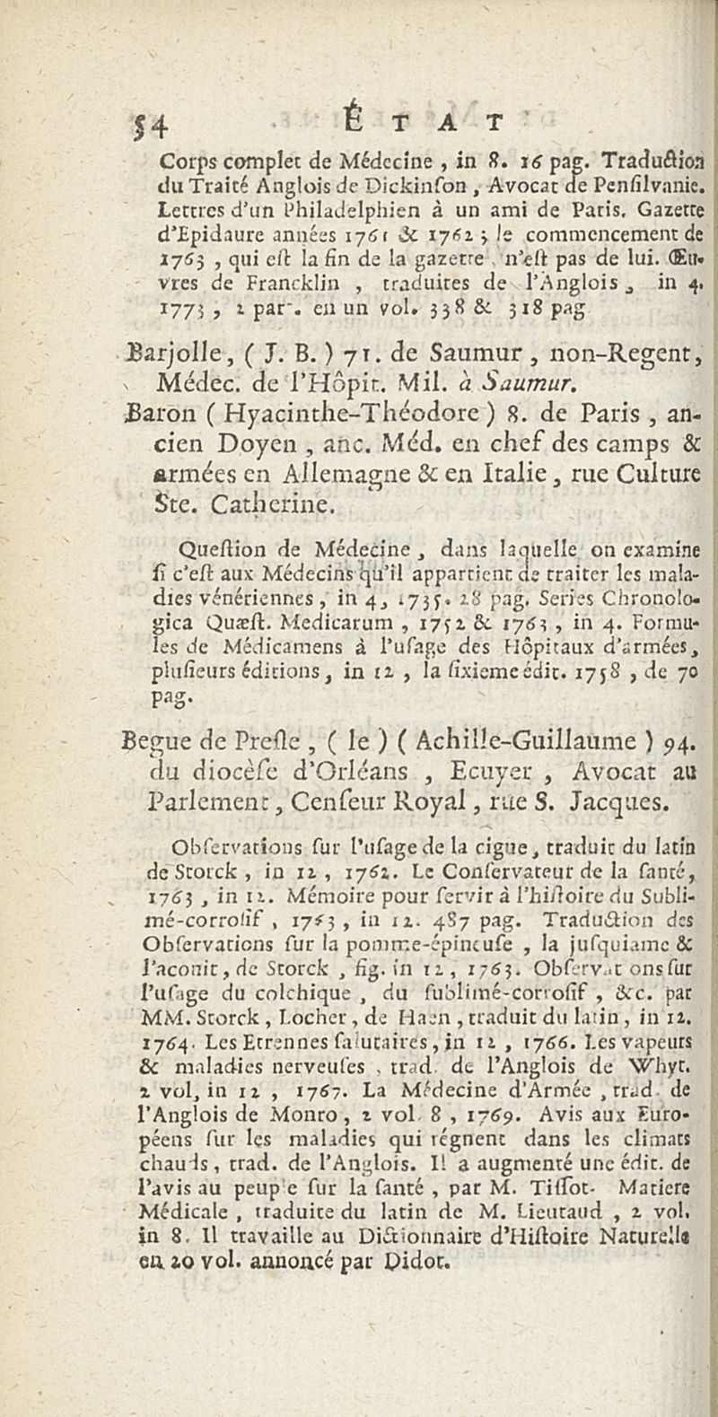 État de médecine, chirurgie et pharmacie, en Europe pour l'année 1776 présenté au Roi