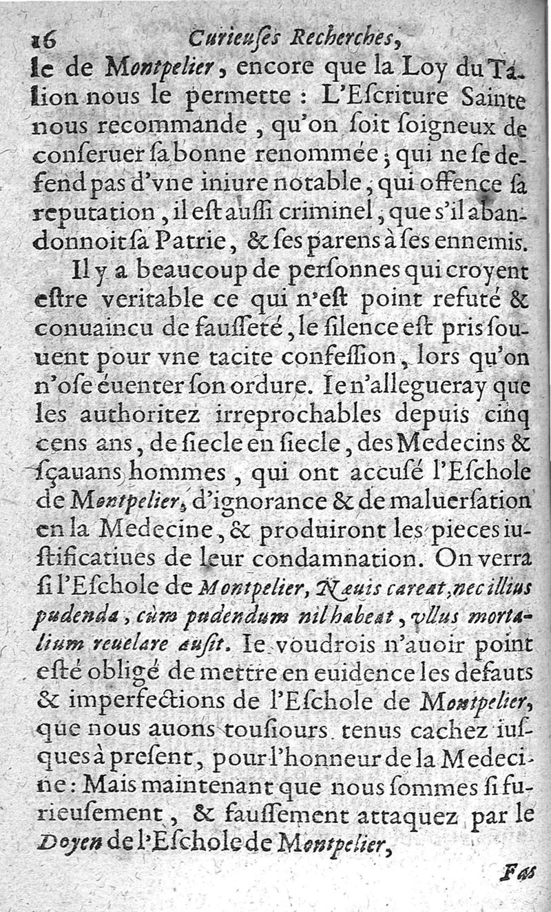 Curieuses recherches sur les escholes en médecine de Paris et de Montpellier, nécessaires d'estres sceuës pour la conservation de la vie, par un ancien docteur en médecine de la faculté de Paris
