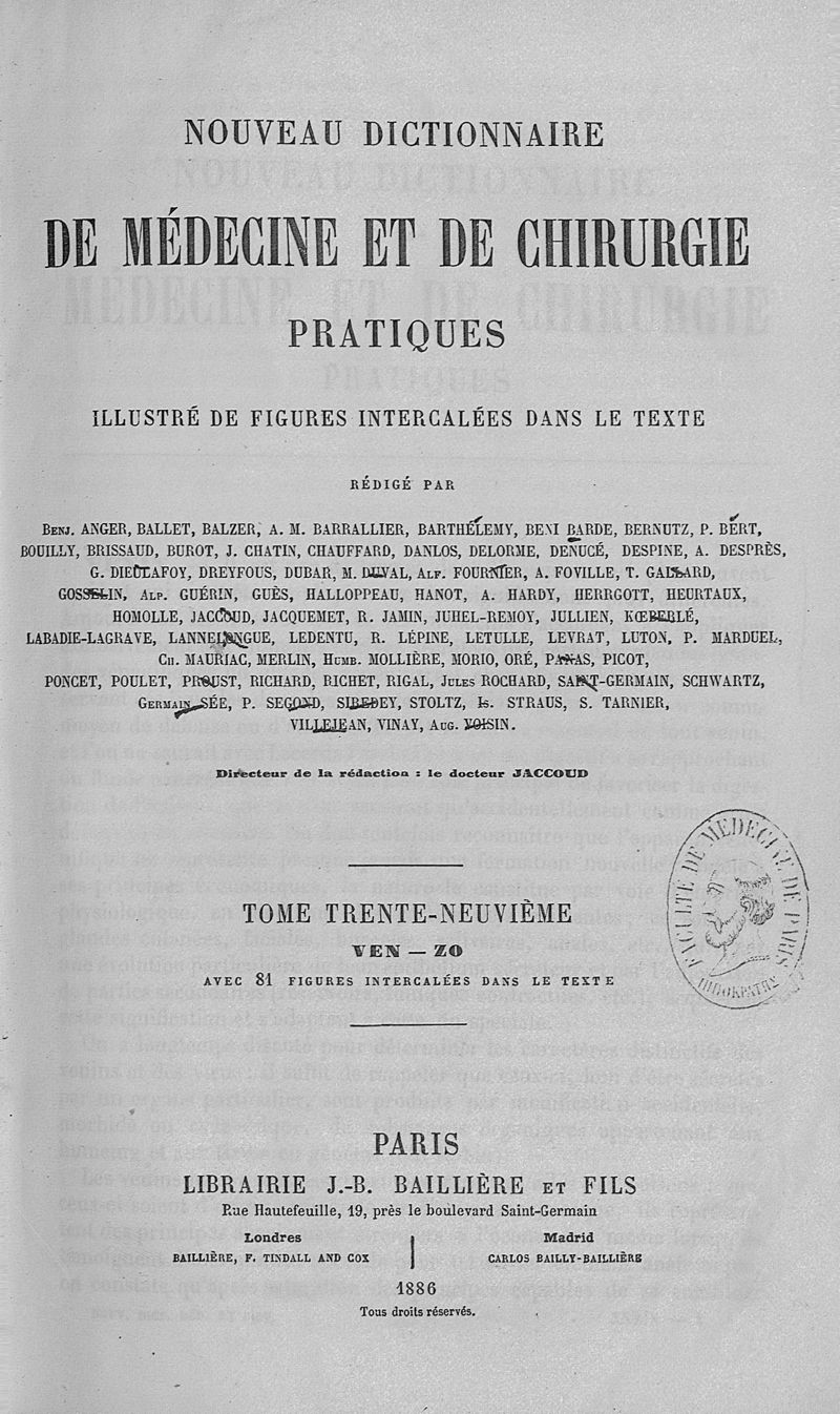 Nouveau dictionnaire de médecine de chirurgie pratiques, illustré de figures intercalées dans le texte, sous la direction du Dr Jaccoud. Tome 39