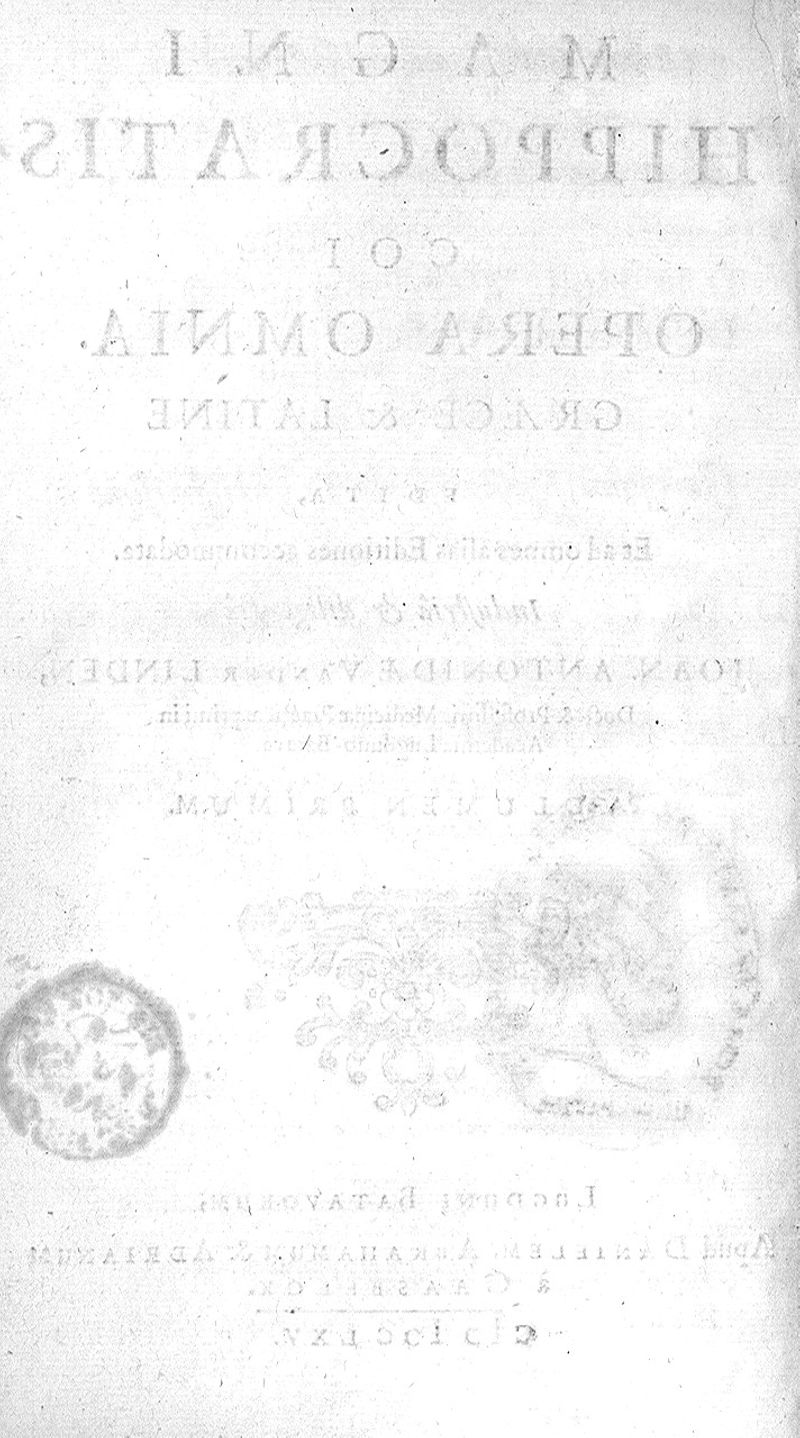 Magni Hippocratis Coi Opera omnia graece et latine edita... industria ac diligentia Joan. Antonidae Van der Linden volumen primum