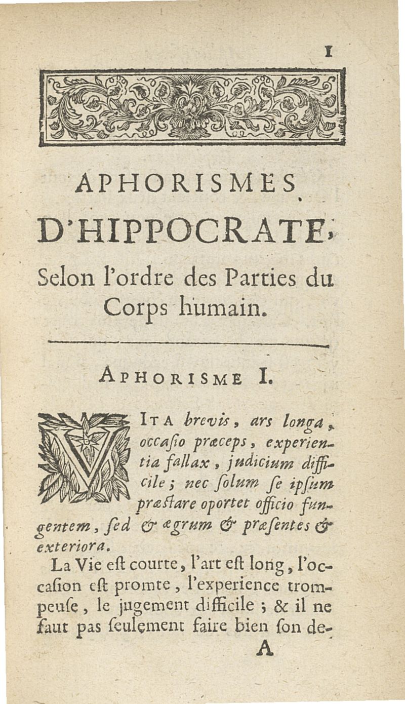 Les Aphorismes d'Hippocrate, rangez selon l'ordre des parties du corps humain...