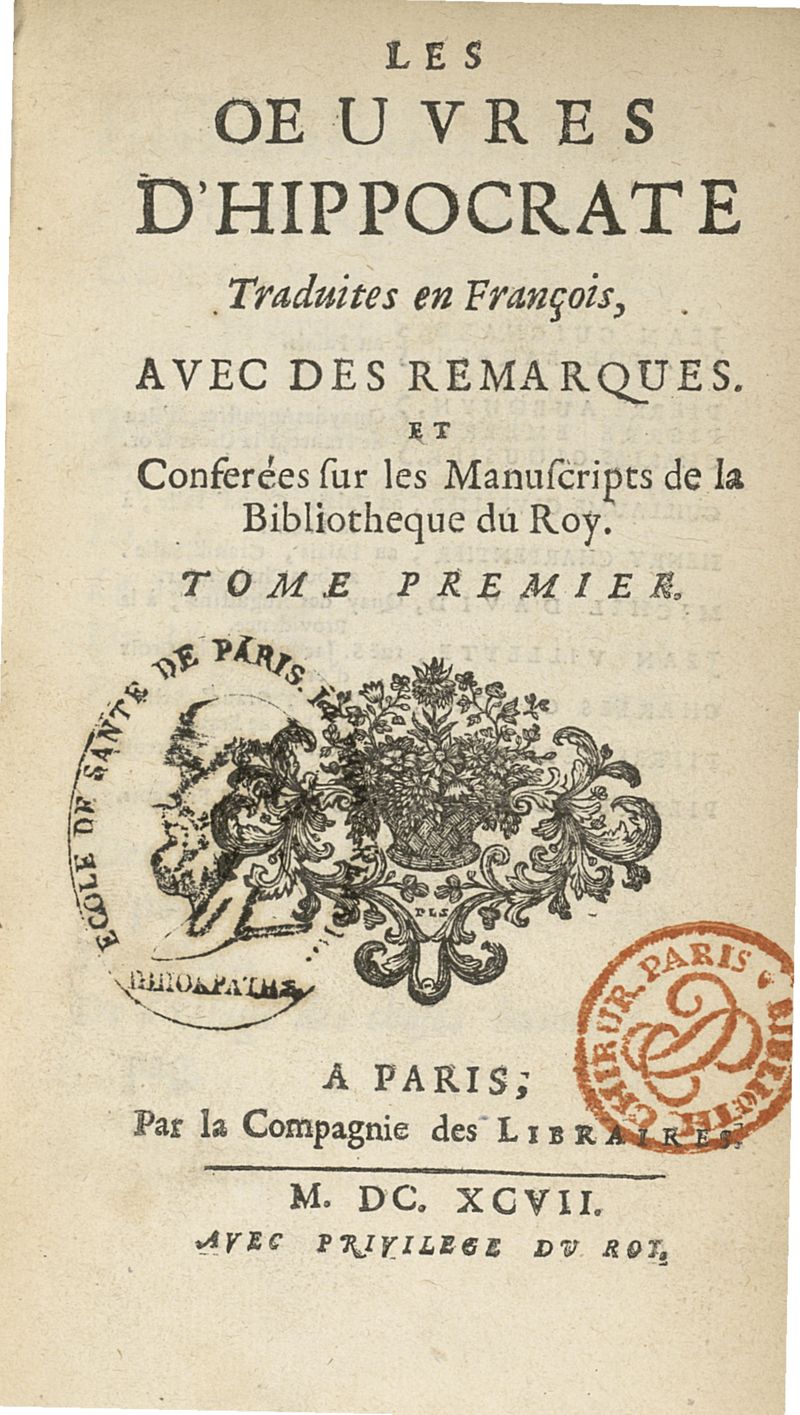 Les Oeuvres d'Hippocrate traduites en françois, avis des remarques et conferées sur les manuscripts de la Bibliothèque du Roy. tome premier