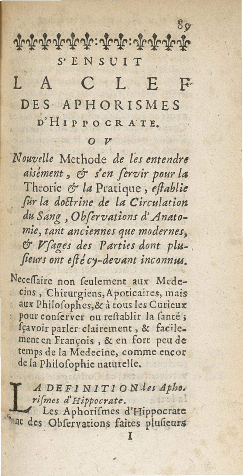 Les Aphorismes d'Hippocrate, traduits nouvellement en françois...et la clef de cette doctrine...[trad. par Meyssonnier]