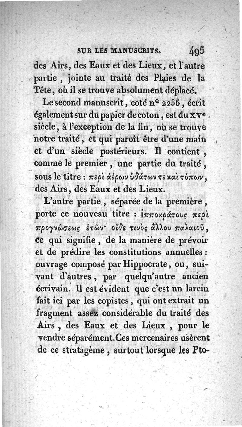 Traités d'Hippocrate : Du régime dans les maladies aiguës : Des airs, des eaux et des lieux trad. sur le texte grec, d'après la collation des manuscrits de la Bibliothèque du Roi, avec une dissertation sur les manuscrits; les variantes, et des observations analytiques sur la doctrine d'Hippocrate