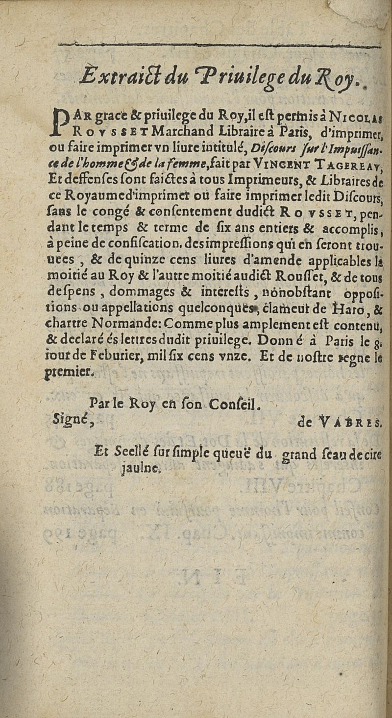 Discours sur l'impuissance de l'homme et de la femme auquel est declaré que c'est qu'Impuissance empeschant & separant le Mariage...