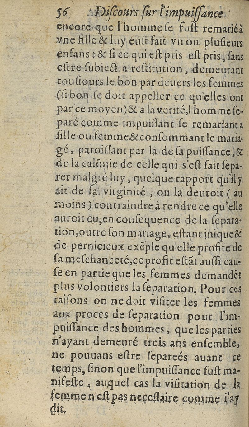 Discours sur l'impuissance de l'homme et de la femme auquel est declaré que c'est qu'Impuissance empeschant & separant le Mariage...