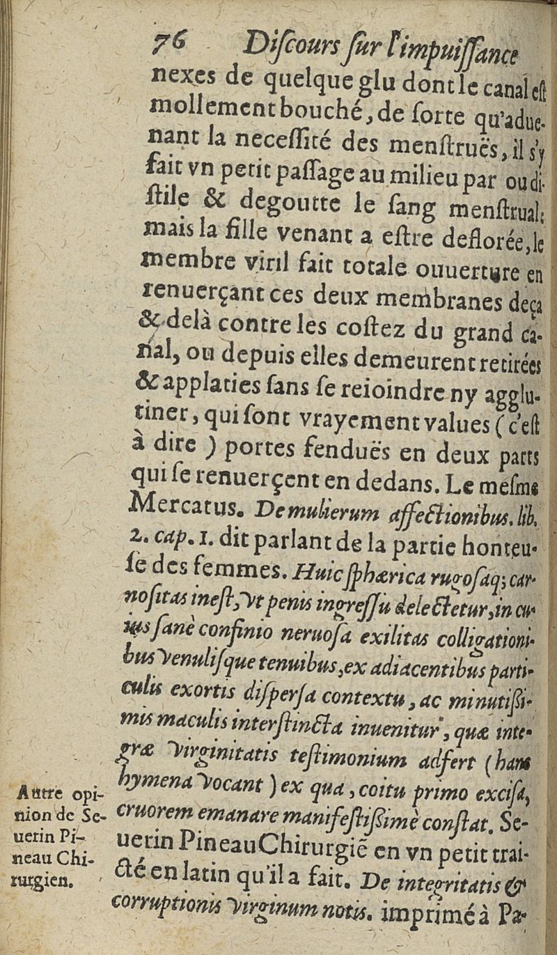 Discours sur l'impuissance de l'homme et de la femme auquel est declaré que c'est qu'Impuissance empeschant & separant le Mariage...
