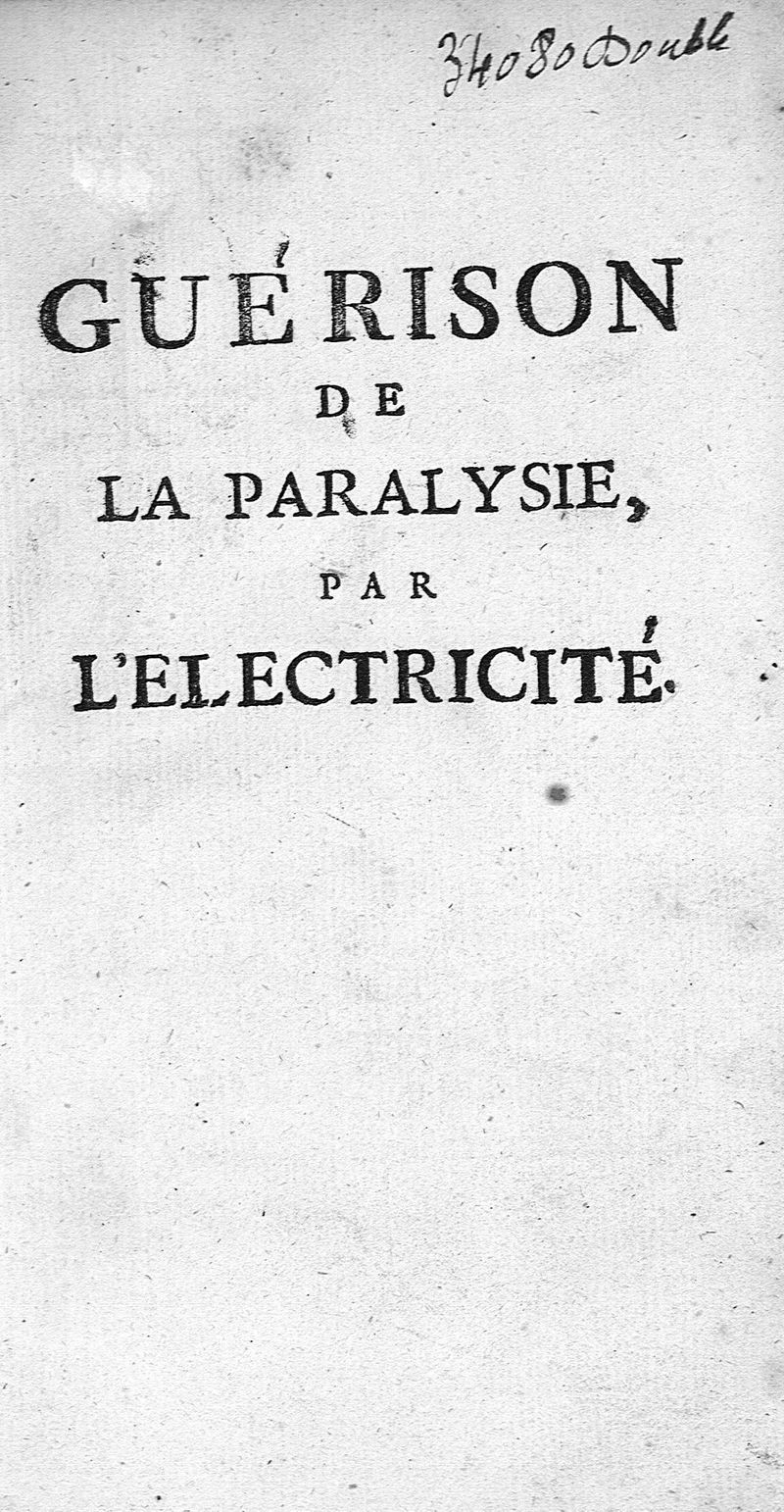 Guérison de la paralysie par l'électricité, ou cette expérience physique employée avec succès dans le traitement de cette maladie regardée jusques à présent comme incurable
