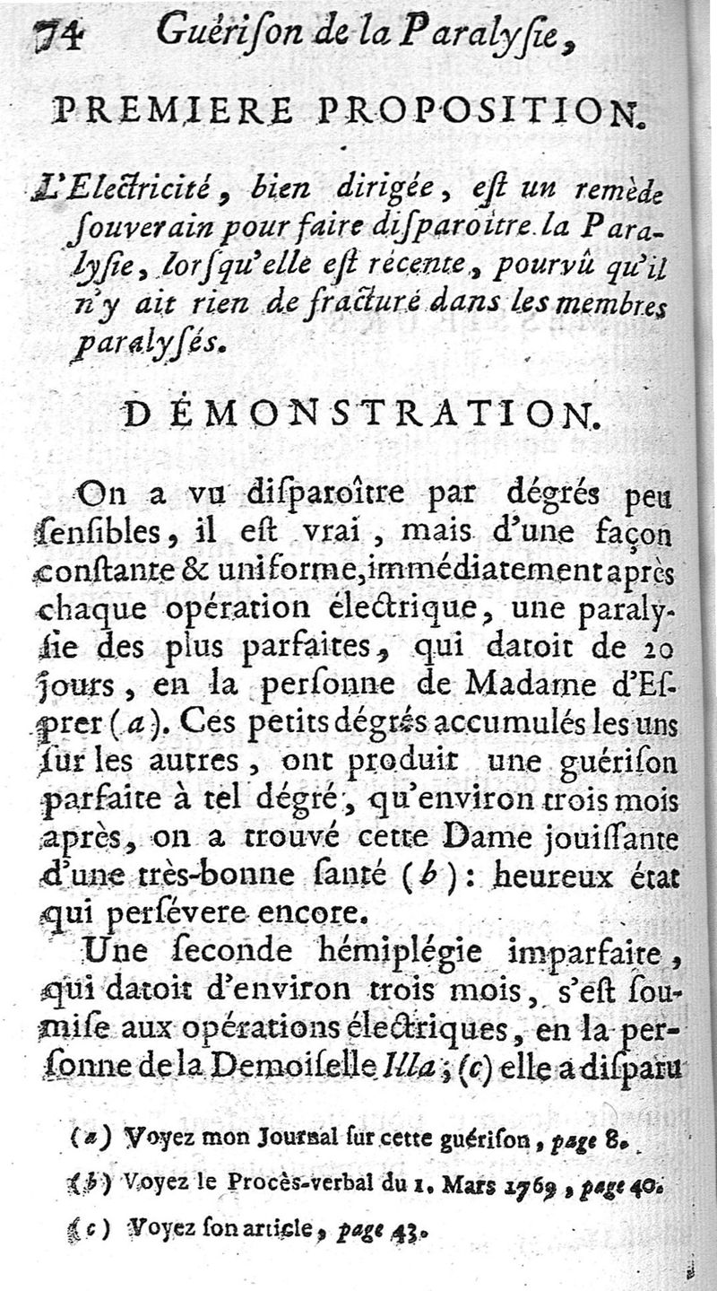 Guérison de la paralysie par l'électricité, ou cette expérience physique employée avec succès dans le traitement de cette maladie regardée jusques à présent comme incurable