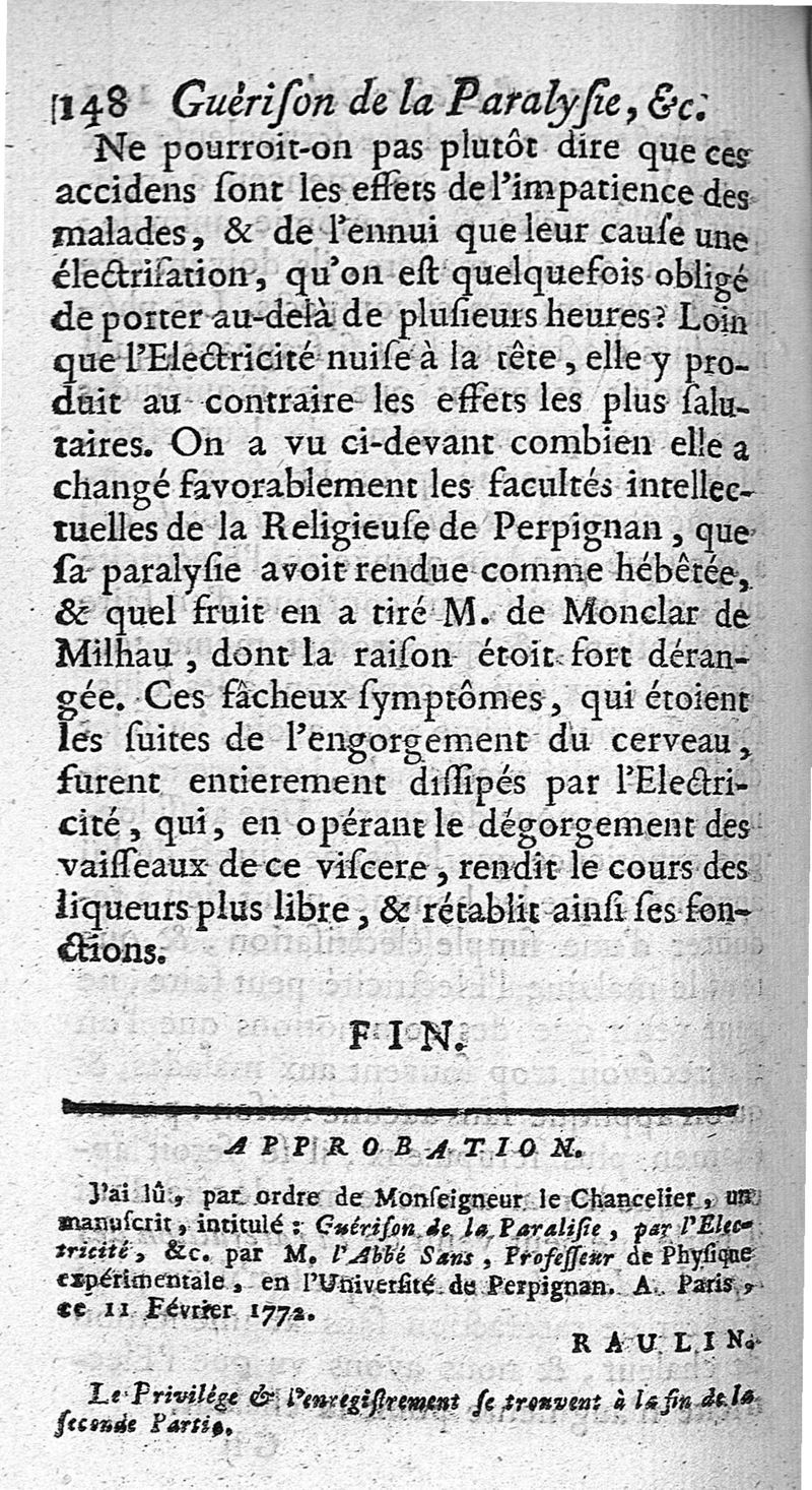 Guérison de la paralysie par l'électricité, ou cette expérience physique employée avec succès dans le traitement de cette maladie regardée jusques à présent comme incurable