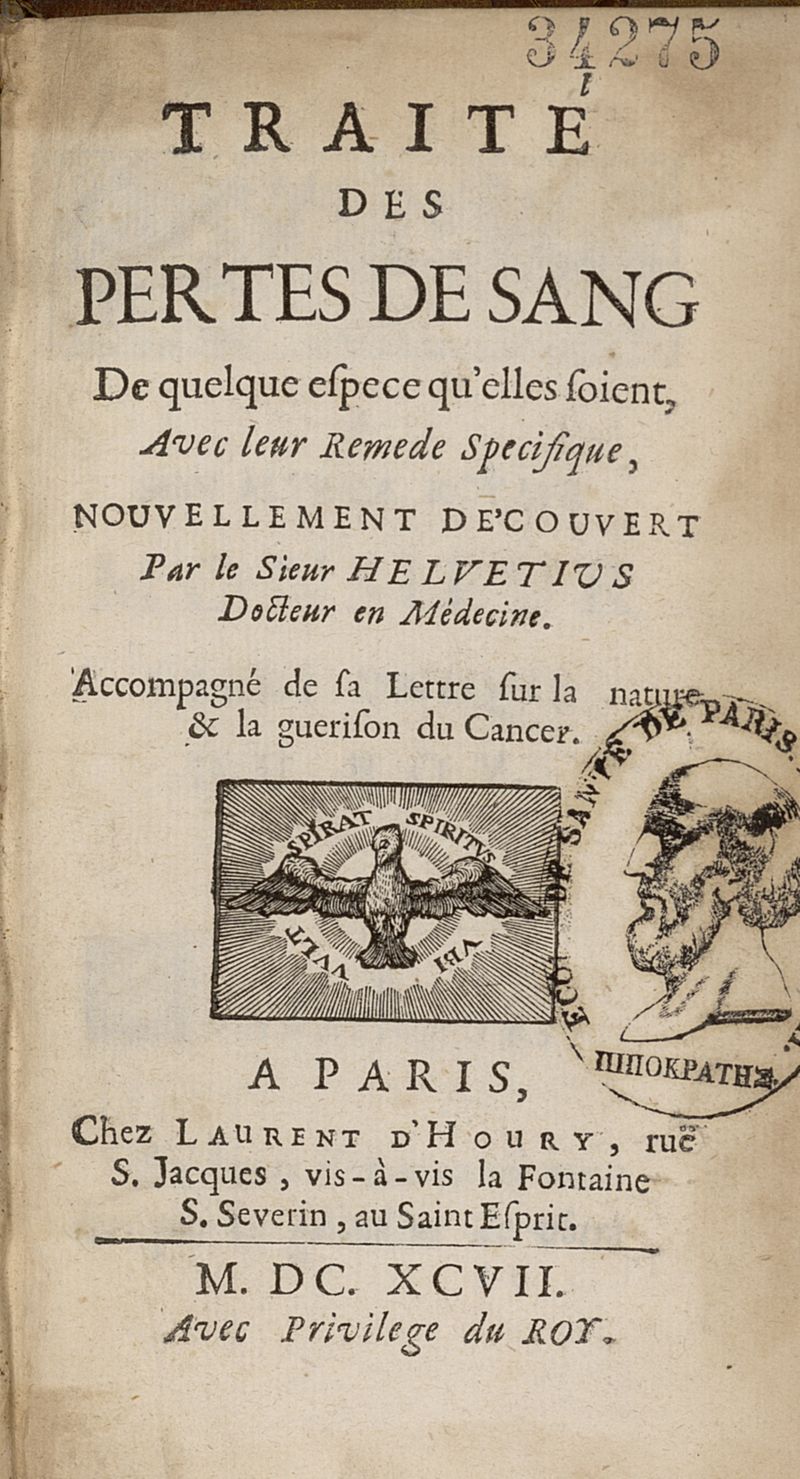 Traité des pertes de sang, de quelque espèce qu'ellles soient avec leur remede specifique, nouvellement découvert...accompagné de sa lettre sur la nature & la guerison du cancer