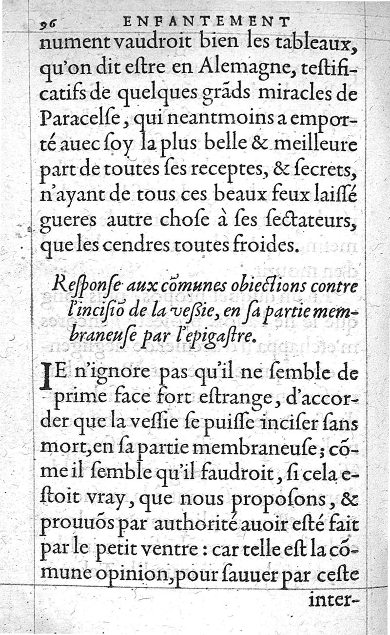 Traitte nouveau de l’Hysterotomotokie,ou Enfantement Caesarien. Qui est Extraction de l’enfant par incision laterale du ventre, et matrice de la femme grosse ne pouvant autrement accoucher. Et ce sans prejudicier à la vie de l’un, ny de l’autre ; ny empescher la fœcondité maternelle par après. Par Françoys Rousset Medecin,