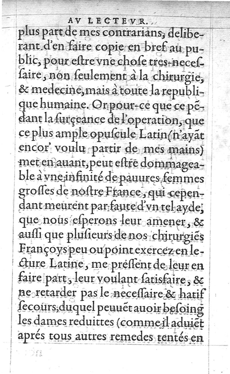 Traitte nouveau de l’Hysterotomotokie,ou Enfantement Caesarien. Qui est Extraction de l’enfant par incision laterale du ventre, et matrice de la femme grosse ne pouvant autrement accoucher. Et ce sans prejudicier à la vie de l’un, ny de l’autre ; ny empescher la fœcondité maternelle par après. Par Françoys Rousset Medecin,