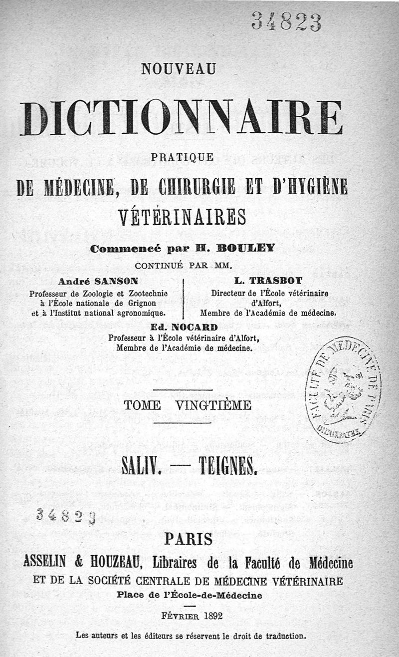 Nouveau dictionnaire pratique de médecine, de chirurgie et d'hygiène vétérinaires / vol. 20 (SALIV - TEIGNES)