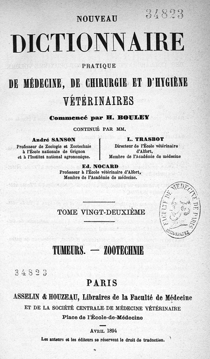 Nouveau dictionnaire pratique de médecine, de chirurgie et d'hygiène vétérinaires / vol. 22 (TUMEURS - ZOOTECHNIE)