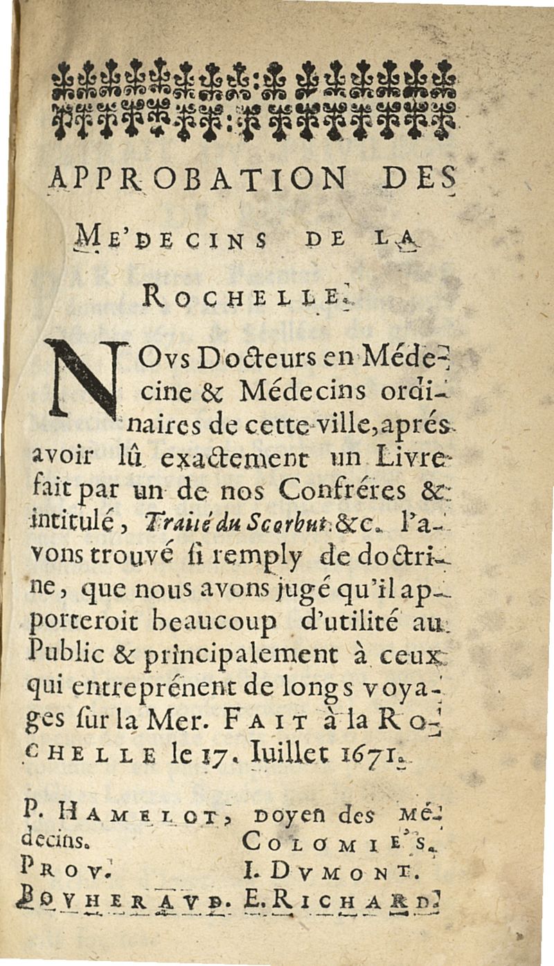 Traité du scorbut, ou l'on peut connoistre fort exactement la plus part des maladies qui arrivent sur la mer, leurs causes, leurs signes et les remedes...