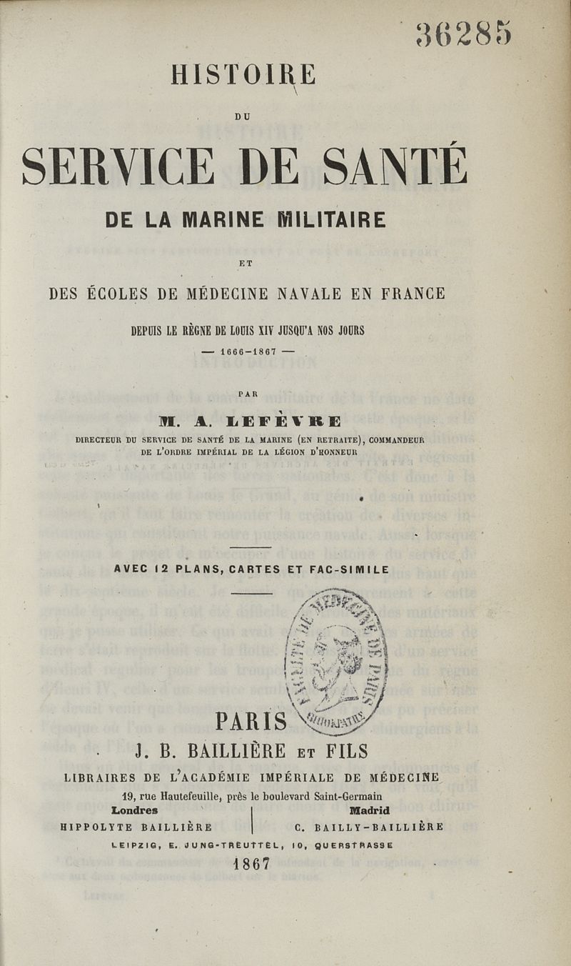 Histoire du service de santé de la marine militaire et des écoles de médecine navale en France depuis le règne de Louis XIV jusqu'à nos jours.